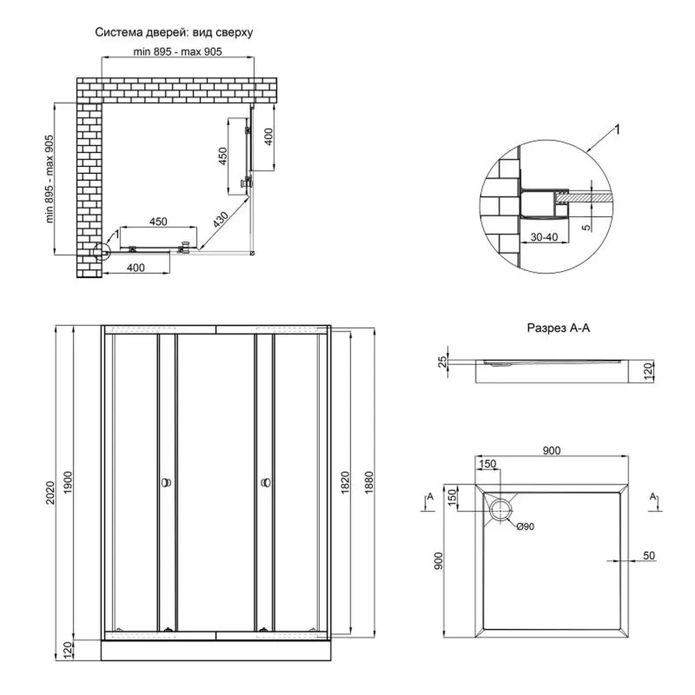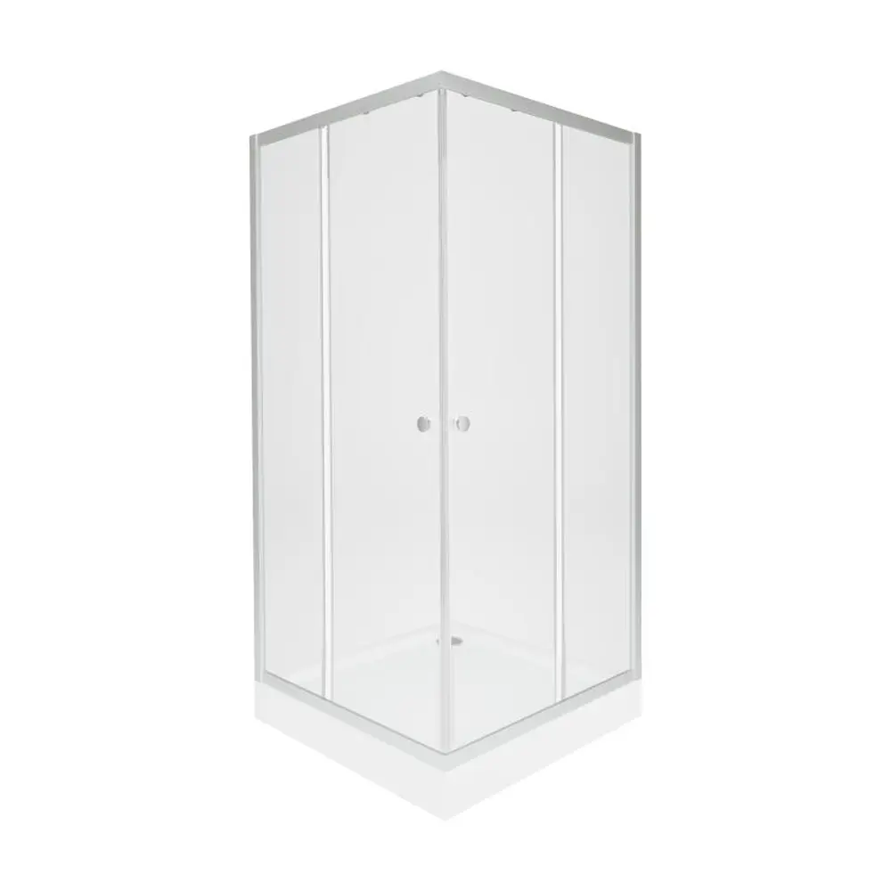 Піддон, сифон, подвійні ролики, ручки, верхній профіль, нижній профіль, бічні профілі, набір ущільнювачів, розширювальні профілі, 2 скляні двері, 2 глухих скла, заглушки, з‘єднувальні елементи, фіксатори, ніжки, комплект кріпильних деталей.