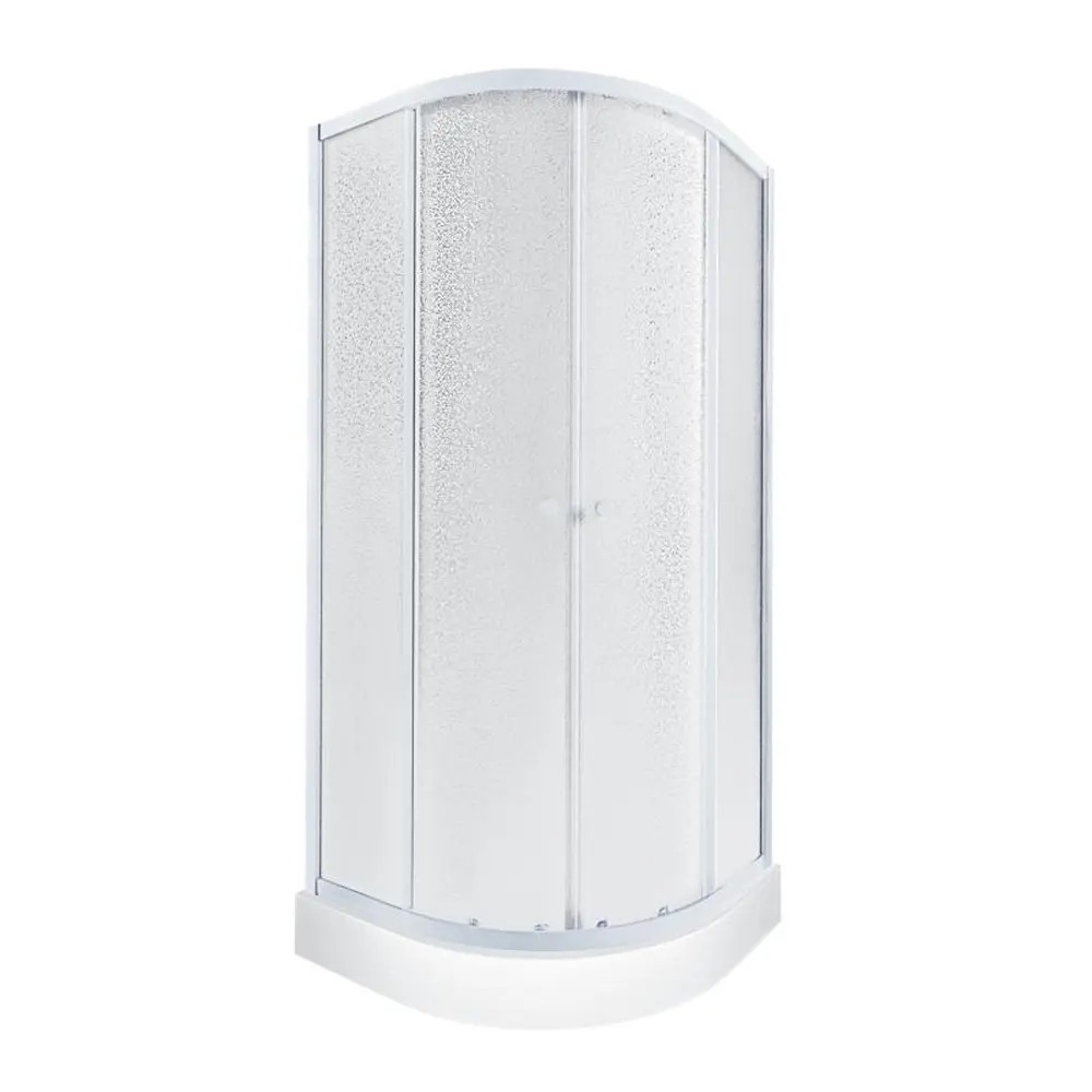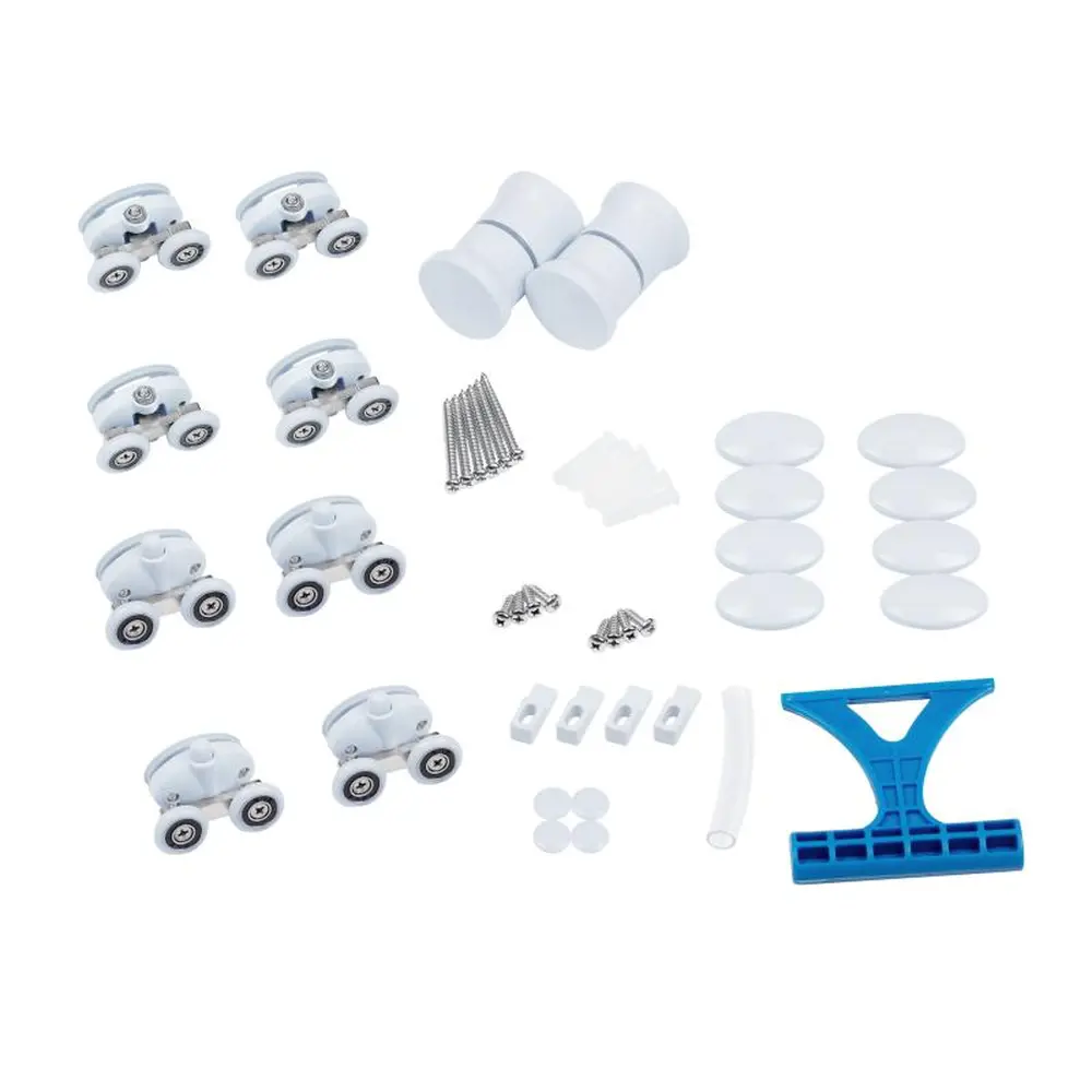 Подвійні ролики, ручки, верхній профіль, нижній профіль, бічні профілі, набір ущільнювачів, розширювальні профілі, 2 скляні двері, 2 глухих скла, комплект кріпильних деталей, заглушки, з‘єднувальні елементи, фіксатори, піддон, ніжки, сифон з гідрозакривом.