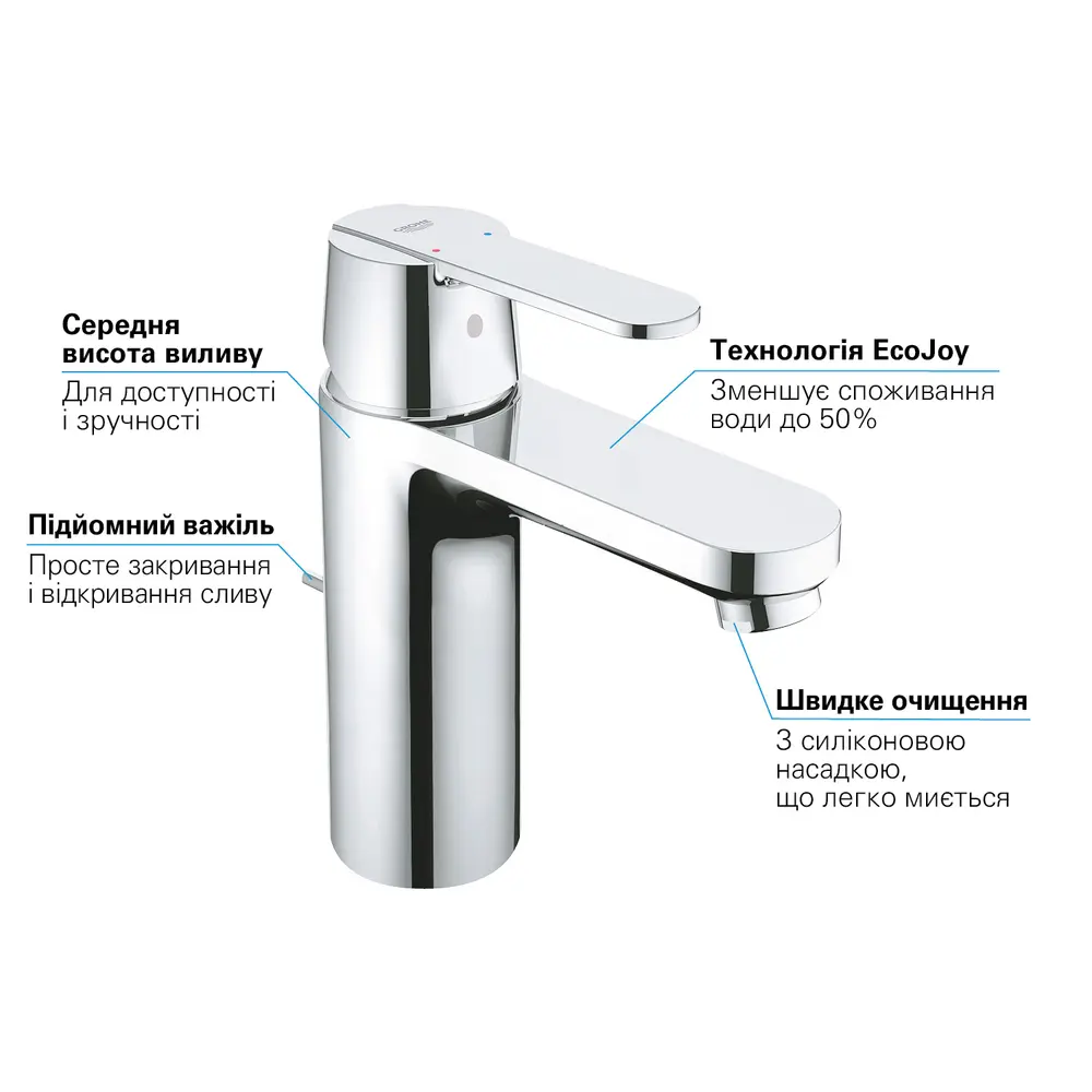 Краще поєднання мінімалістичного дизайну і надійних технологій! Одноважільний змішувач GROHE Get для раковини з виливом середньої висоти і донним клапаном відмінно впишеться в будь-яку сучасну ванну кімнату.