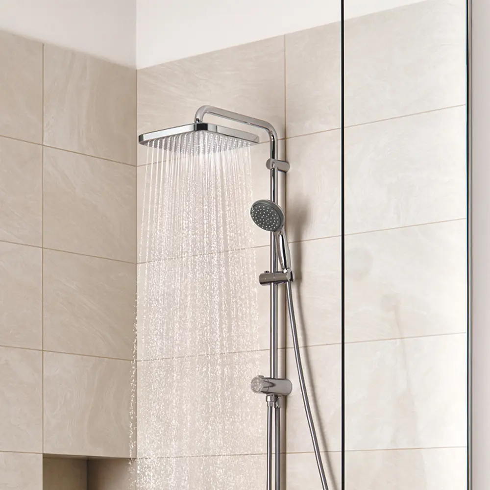 горизонтального 390 мм душового кронштейна, що регулюється перед установкою, - перемикача на 3 положення: верхній душ, ручний душ, верхній душ з Eco режимом, верхній душ Vitalio Comfort 250 (26 695), ручний душ Vitalio Start 100 (27 940), душовий шланг VitalioFlex Trend 1500 мм, душовий шланг VitalioFlex Trend 1250 мм, верхній душ з шаровим шарніром, кут обертання ±10°, GROHE EcoJoy обмежувач витрати води 9.5 л/хв