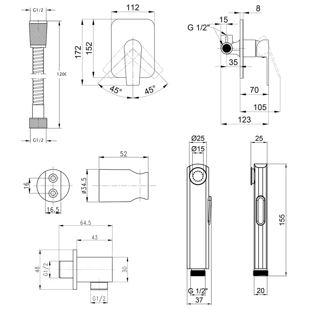 Змішувач прихованого монтажу, Кронштейн для душу, Шланг під'єднення, Лійка, Шланг, Кріплення