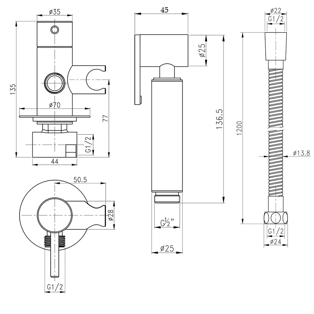 Змішувач зі шланговим з‘єднанням, Лійка для гігієнічного душу, Душовий шланг, Ключ, Кріпильні деталі