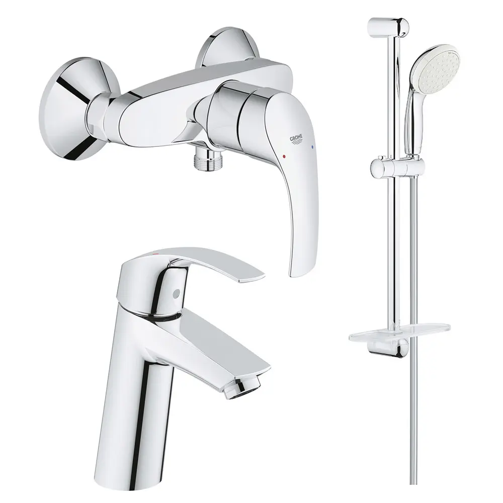 Набор смесителей Grohe Eurosmart M-Size 123244M станет уместным в интерьере любой современной ванной комнаты. Набор состоит из смесителя для душа Eurosmart (33555002), смесителя для раковины Eurosmart (23324001), душевого гарнитура New Tempesta 100 (27926001). Удобство и простота монтажа, оптимальное распределение воды в душевой воронке, плавность хода рычагов будут весомыми аргументами в пользу выбора данных смесителей.