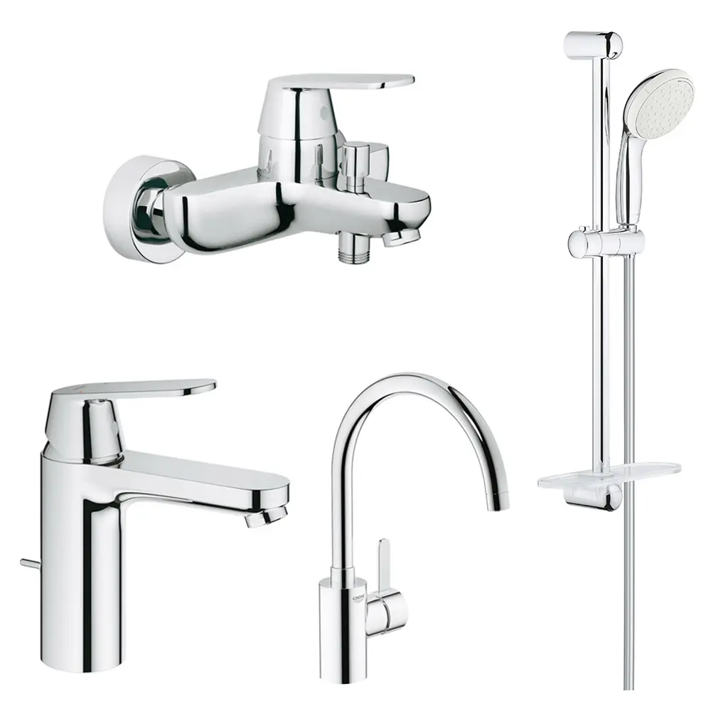 Набор смесителей Grohe Eurosmart M-Size 126115MK представляет собой комплексное решение для ванной и кухни. В комплекте смеситель для ванны Eurosmart Cosmopolitan (32831000), смеситель для раковины Eurosmart Cosmopolitan (23325000), смеситель для кухни Eurosmart Cosmopolitan (32843000), душевой гарнитур New Tempesta 100 (27926001). Набор легко монтируется, имеет качественное хромированное покрытие, смесители - с удобными и плавными рычагами.