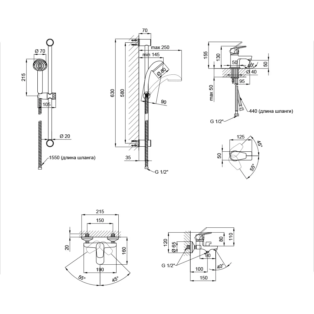 Змішувач для ванни, Змішувач для раковини, Душовий гарнітур, Лійка для ручного душу, Душовий шланг, Кронштейн для ручного душу, Душова стійка, Гнучкий підвід, Кріпильні деталі