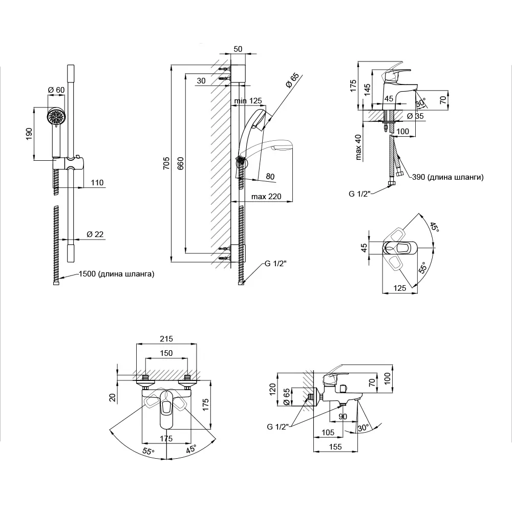 Змішувач для ванни, Змішувач для раковини, Душовий гарнітур, Лійка для ручного душу, Душовий шланг, Кронштейн для ручного душу, Душова стійка, Гнучкий підвід, Кріпильні деталі