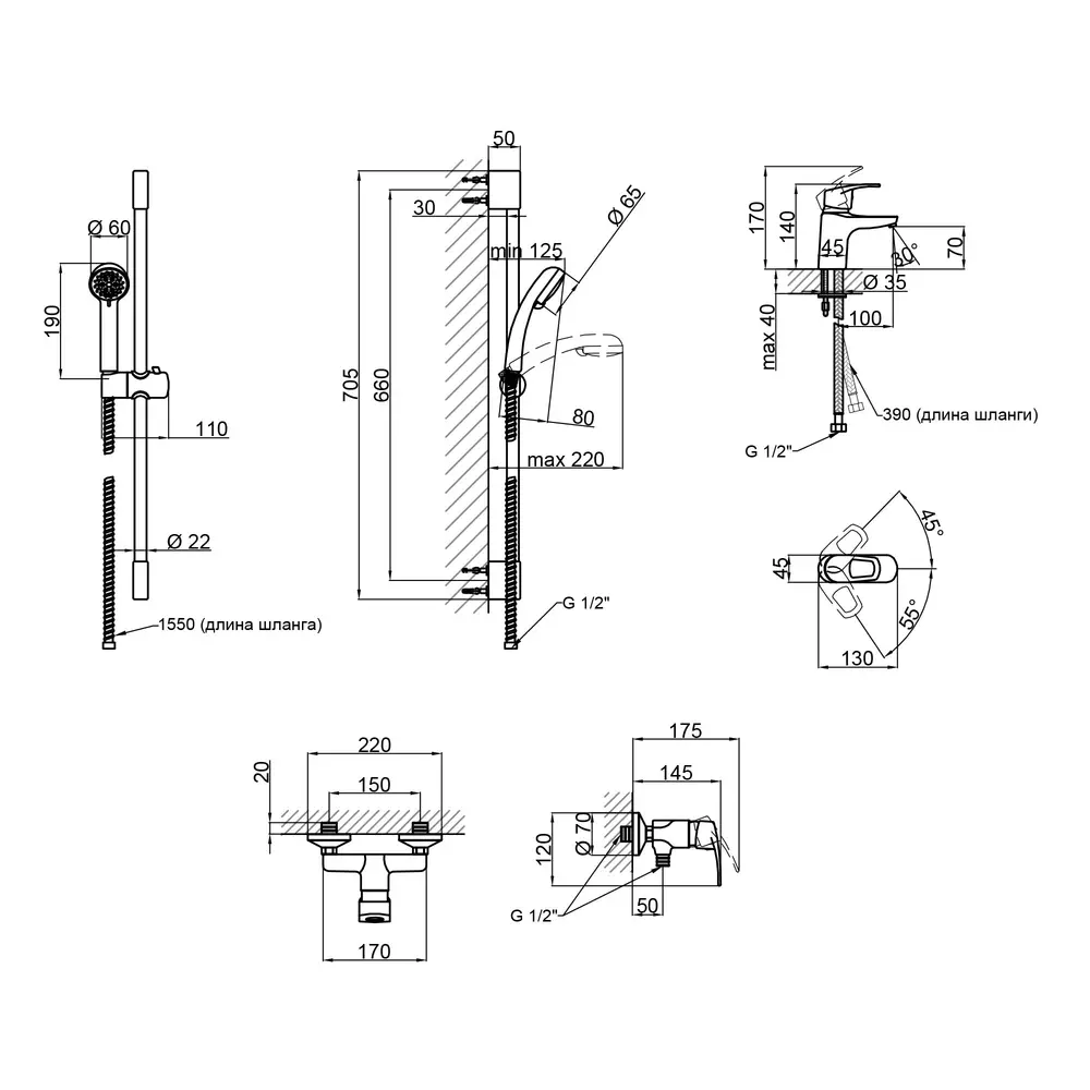 Змішувач для душу: 145. Змішувач для раковини: 130