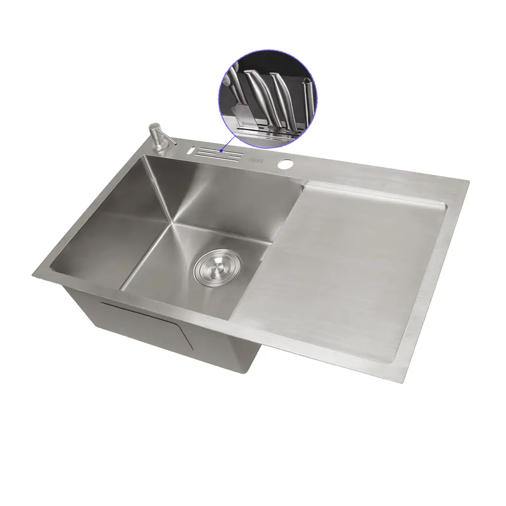 Унікальна особливість нашої мийки – вбудовані отвори для ножів. Тепер вам не доведеться купувати окремі підставки та піклуватися про чистоту вашої робочої поверхні.