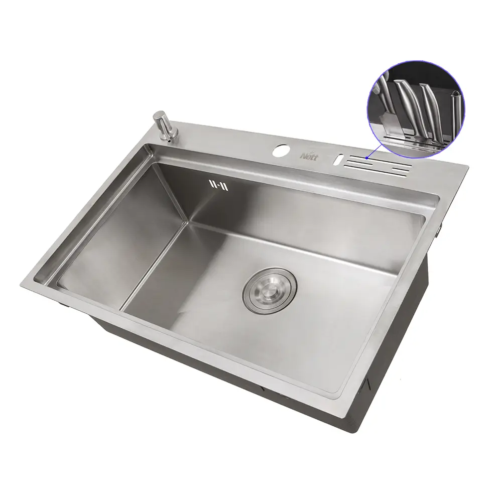 Тільки у нас доступна мийка нового покоління з інтегрованим отвором для ножів. Тепер немає необхідності витрачати простір на окрему підставку для ножів та прибирати непотрібні предмети, що створюють додаткові зони скупчення бруду на кухні!