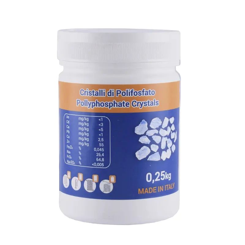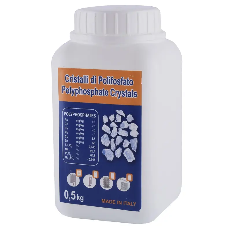 • Сіль поліфосфатна – кристалічна добавка, яка захищає трубопроводи та нагрівальні елементи техніки від накипу. Утворює захисну плівку на внутрішніх поверхнях, запобігаючи осіданню солей жорсткості. Часто використовується у фільтрах грубого очищення, пральних машинах, бойлерах.