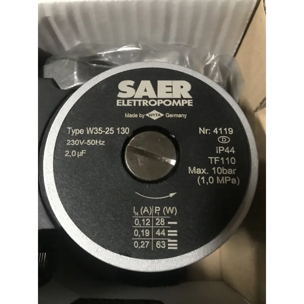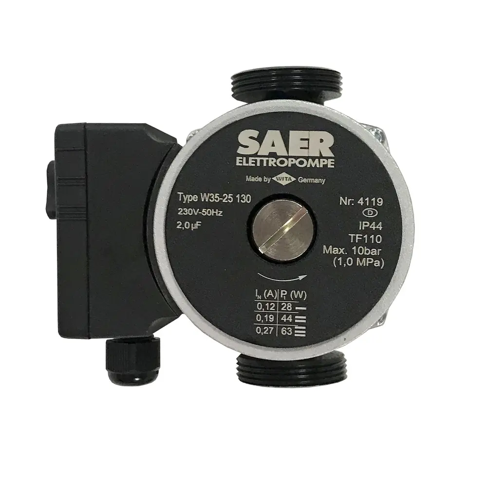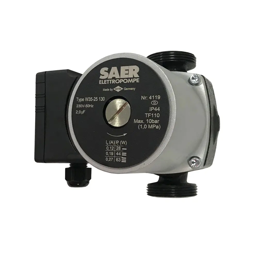 Циркуляционный насос SAER W35-25 130мм - это циркуляционный насос однофазный с «мокрым ротором» и регулируемой скоростью предназначен для применения в отопительных системах закрытого типа с принудительной циркуляцией или в системах с открытым расширительным баком.