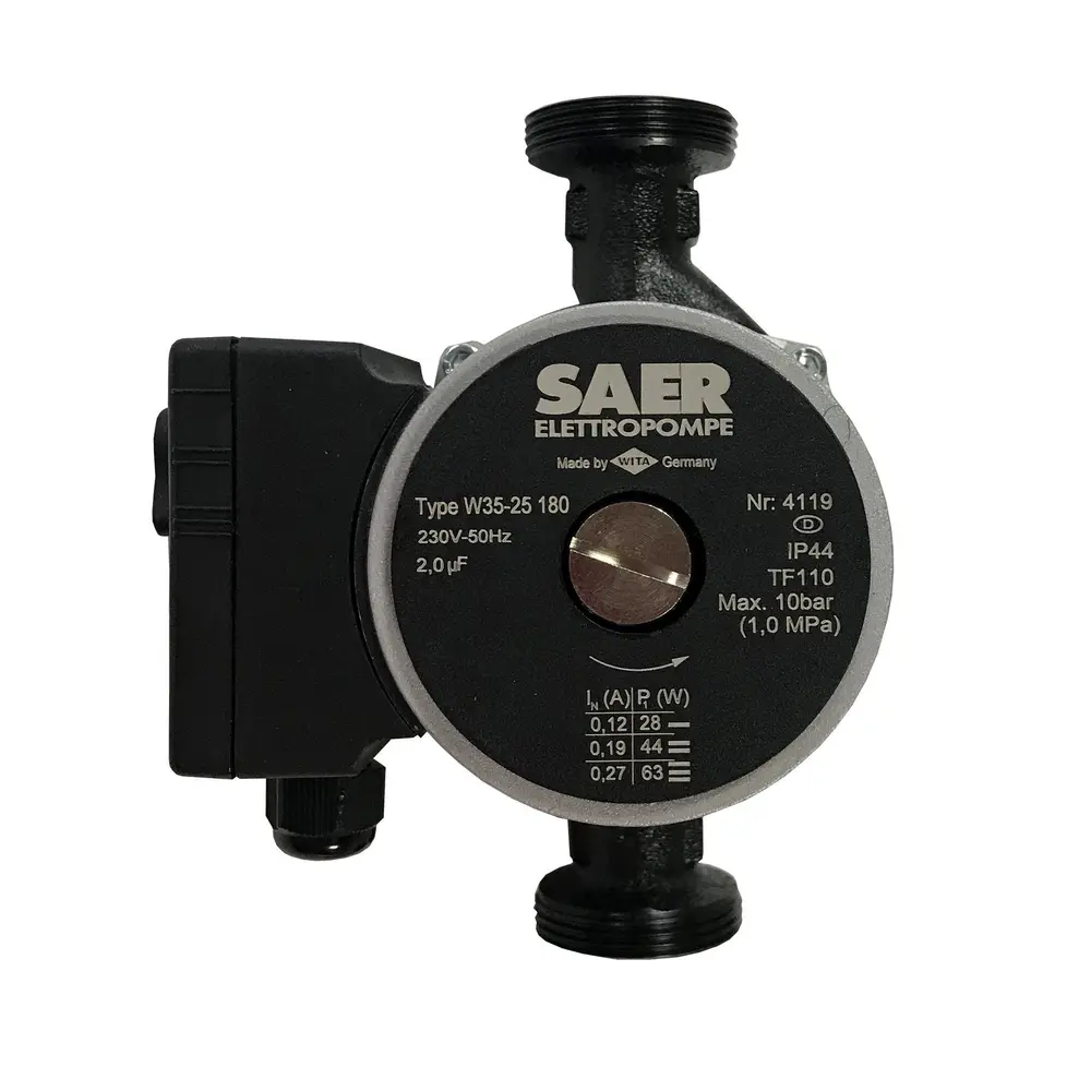 Циркуляционный насос SAER W35-25 180мм - это циркуляционный насос однофазный с «мокрым ротором» и регулируемой скоростью предназначен для применения в отопительных системах закрытого типа с принудительной циркуляцией или в системах с открытым расширительным баком.