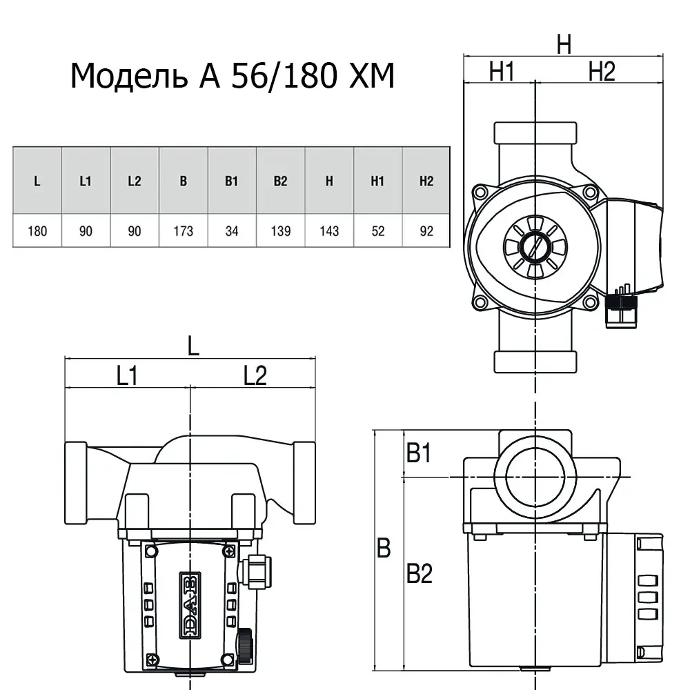 Насос циркуляційний DAB A 56/180 XM використовують у складі систем опалення та кондиціонування. При встановленні та подальшій роботі вал двигуна має бути розміщений вздовж лінії обрію, монтажна база становить 180 см. Пристрій забезпечить циркуляцію теплоносія в інженерній системі. Згідно з експлуатаційними вимогами, насос призначений для перекачування чистої води, температура якої не перевищує 110 °C. Для підключення до трубопроводу виріб забезпечений патрубками з різьбою 2"G.