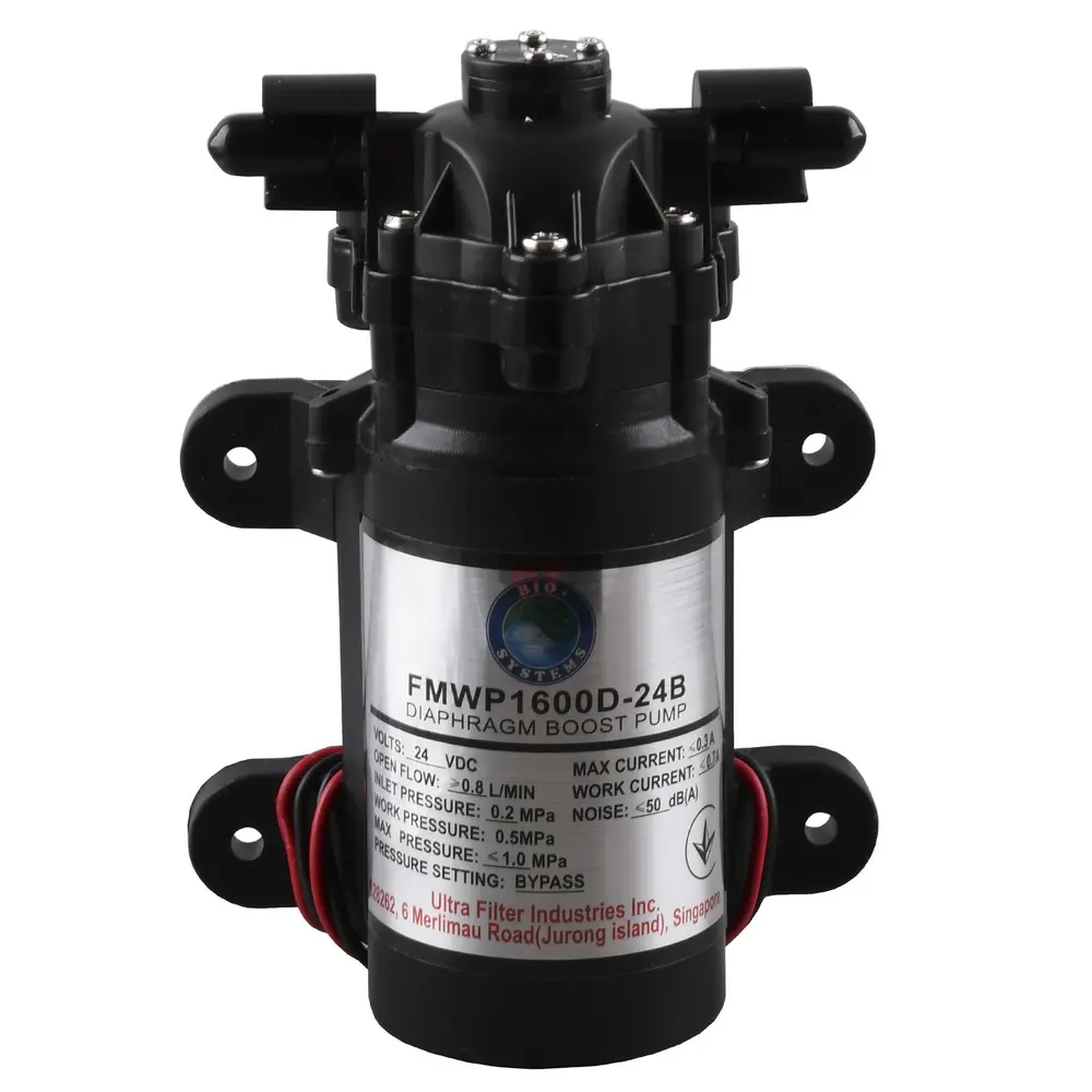 Насос (помпа) повышение давления для системы обратного осмоса, используется при низком давлении воды (меньше 2,5 атм) в водопроводной сети. Насос обеспечивает стабильное давление воды и подходит для мембран, производительностью до 75 GPD. Под крышкой данного насоса находится компенсатор, который уменьшает вибрацию.