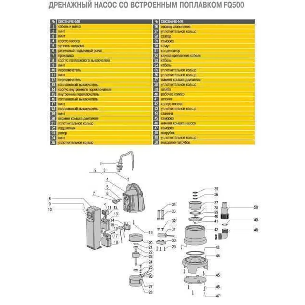 Насос складається з трьох основних вузлів - електродвигуна, відцентрового насоса і поплавкового вимикача. У нижній частині насоса розташовані усмоктувальні отвори. Корпус насоса і робоче колесо виконані з матеріалу, що має високі механічні властивості.