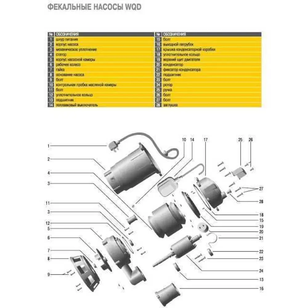 Корпус насосної частини і робоче колесо виготовлено з чавуну. Надійність елементів ущільнювачів фекального насоса повністю ізолює електродвигун від контакту з рідиною, що перекачується і захищає від надлишкових тепла і вологи. Наявність таких особливостей, як подвійне торцеве ущільнення валу в маслозаповнені камері і маслозаповненому двигуні гарантують охолодження насоса навіть у разі його занурення в рідину менш ніж на половину. Також насос обладнаний поплавковим вимикачем, що забезпечує роботу насоса в автоматичному режимі. Напруга мережі: 230V - 50Hz.