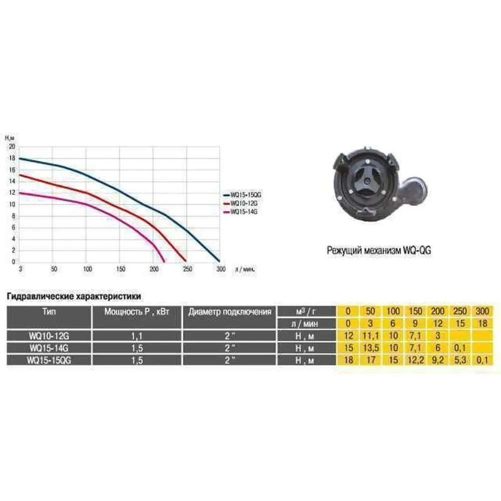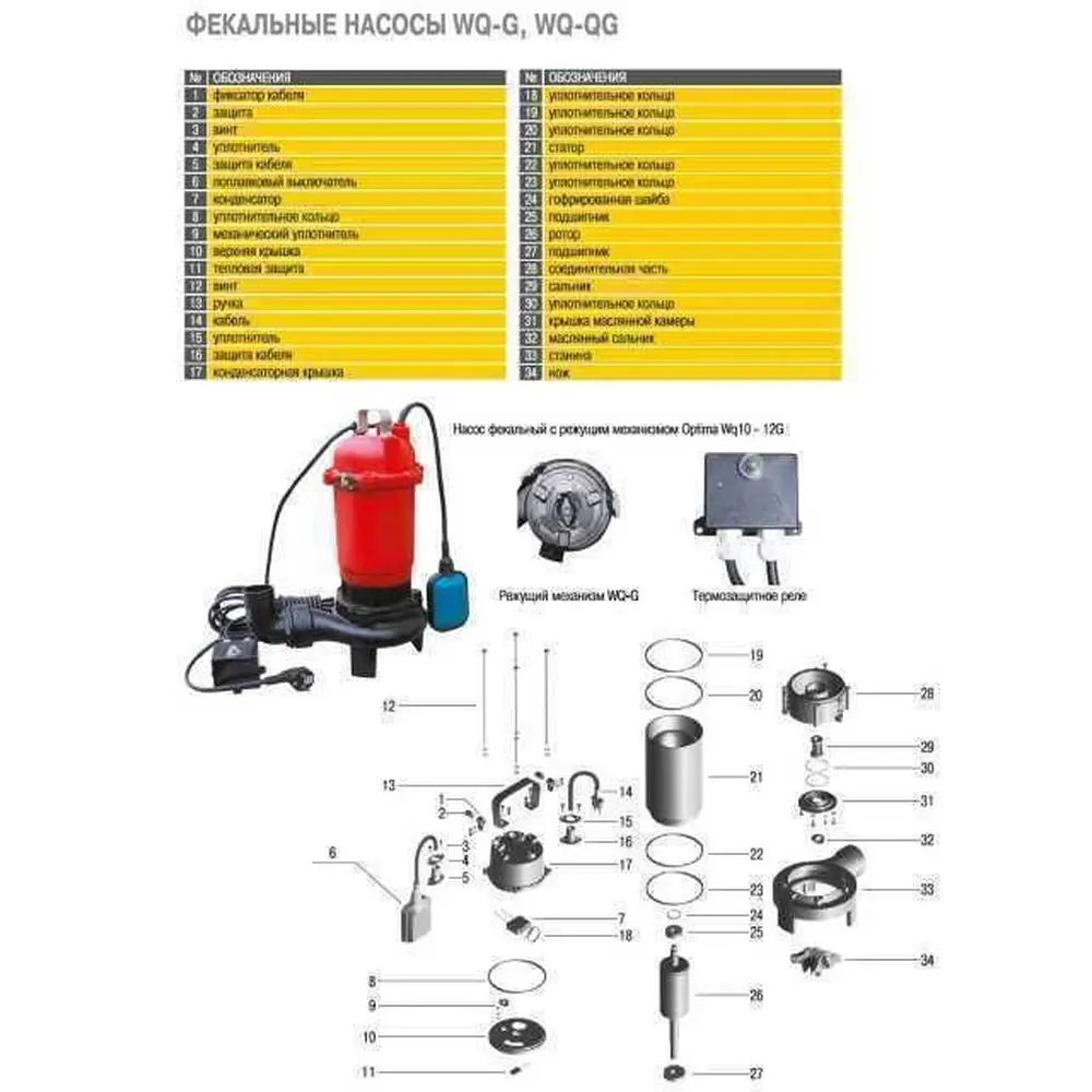 Корпус насосної частини і робоче колесо виготовлено з чавуну. Надійність елементів ущільнювачів фекального насоса повністю ізолює електродвигун від контакту з рідиною, що перекачується і захищає від надлишкових тепла і вологи. Наявність таких особливостей, як подвійне торцеве ущільнення валу в маслозполненной камері і маслозаповнений двигун, гарантують охолодження насоса навіть у разі його занурення в рідину менш ніж на половину. Робоче колесо з ріжучим механізмом дозволяє подрібнювати різноманітні відходи, які транспортуються зі стічними водами-шматки тканини, шнури і ін. Також насос обладнаний поплавковим вимикачем, що забезпечує роботу насоса в автоматичному режимі. Напруга мережі: 230V - 50Hz. Термозахисне реле вбудоване у виносний блок.