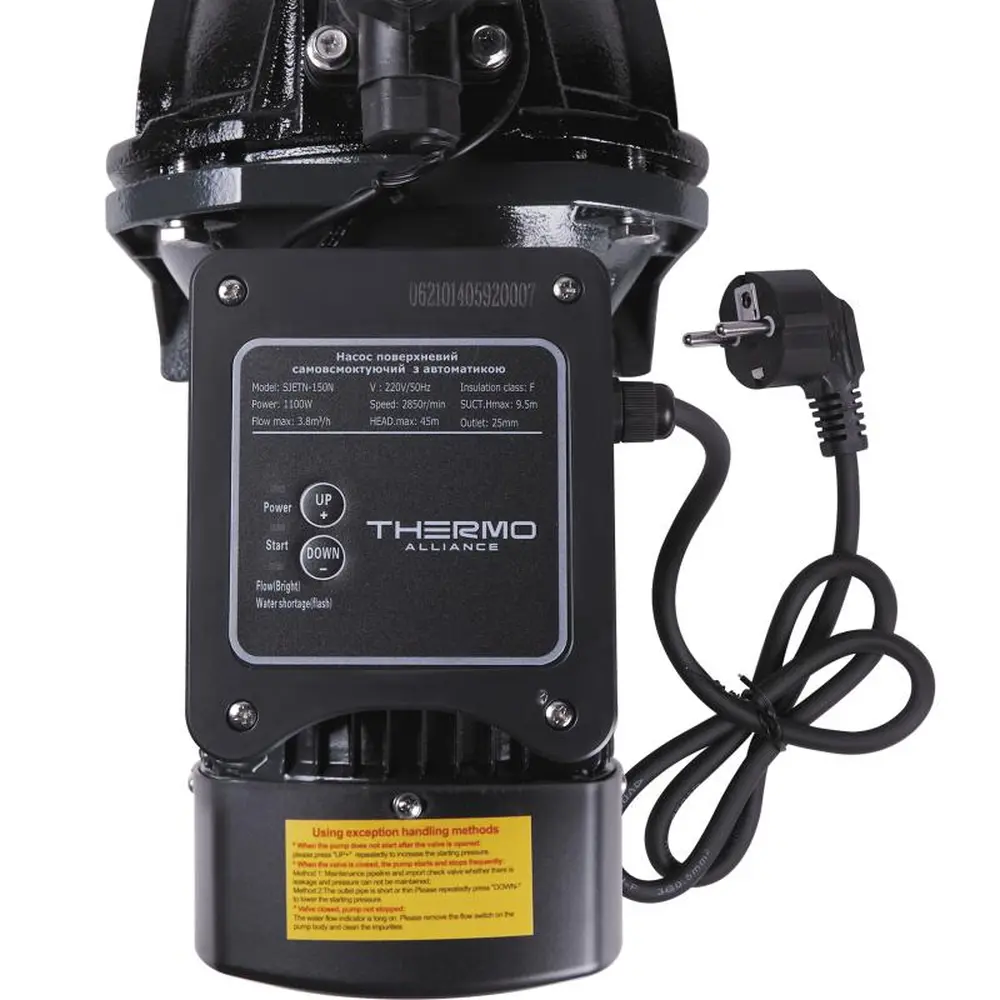 Насос поверхневий самовсмоктувальний Thermo Alliance SJETN-150N 1,1 кВт — сучасне обладнання, оснащене автоматикою і блоком електронного управління, датчиком тиску з автоперемикачем потоку, зворотним клапаном. У системах крапельного зрошення, поливу садів, городів такі насоси застосовують для подачі води з відкритих водойм, свердловин чи колодязів, накопичувальних резервуарів тощо. Також використовують для підвищення тиску в інженерних мережах різного призначення. Споживана потужність — 1,1 кВт.
