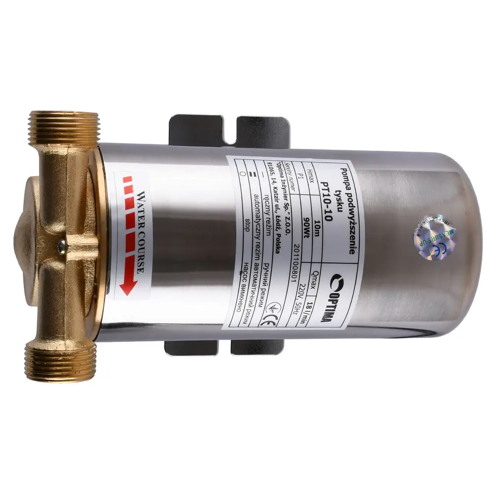 Насос підвищення тиску Optima PT10-10 нержавіючий корпус (з «сухим ротором») використовується для підвищення тиску в системах водопостачання індивідуального типу. Допускається перекачування тільки чистої води без хімічних і механічних домішок. Невеликі габарити і вага, конструктивне виконання з патрубками в лінію дозволяють виконувати монтаж насоса безпосередньо на трубопроводі. Насос працює практично безшумно, тому їх можна встановлювати в будь-якому місці будинку або квартири. Модель виконана в корпусі з нержавіючої сталі, що підвищує надійність і тривалість служби.