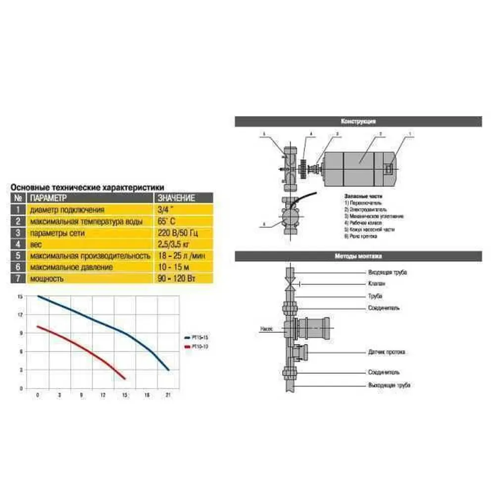Насос може працювати як в ручному, так і в автоматичному режимах, за допомогою реле протоку води - тобто включається і вимикається автоматично, в залежності від потреб споживача. Насос відрізняється безшумністю роботи, простотою конструкції і низьким енергоспоживанням. В автоматичному режимі датчик протоки включає насос при витраті води менше 1,5 л / хв.