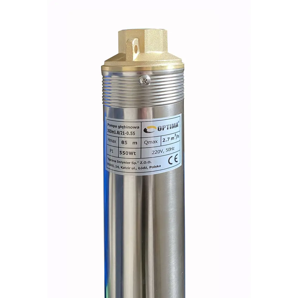 Насос OPTIMA 3SDm1.8 / 21 0.55 кВт 85м складається з двох частин: двигун в нижній частині і насос у верхній частині, жорстко зєднані між собою зубчастої муфтою міжнародного стандарту Nema і має забір води в середній частині корпусу. Насос относятітся до насосів відцентрового типу і має багатоступеневу конструкцію і «плаваючі» робочі колеса, завдяки яким реалізується підвищена стійкість до піску (до 1000 г / м3).