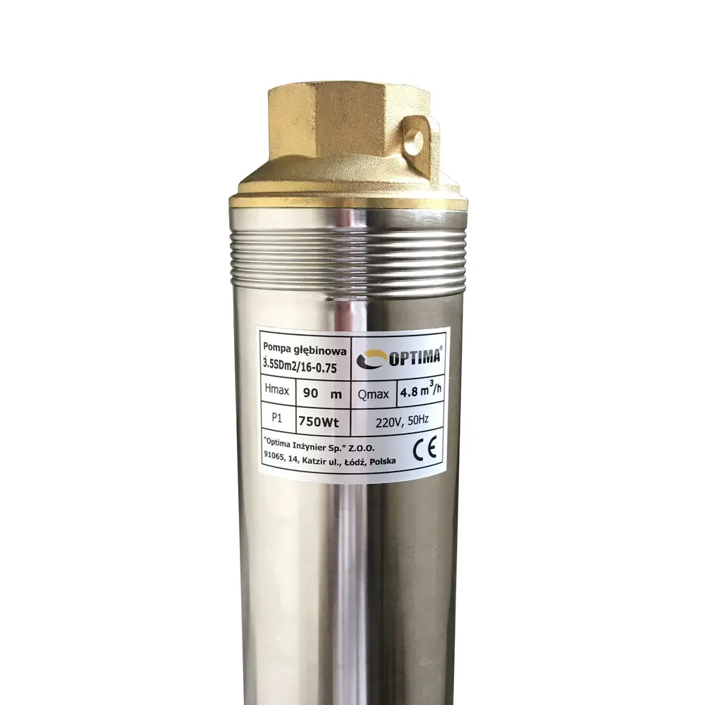 Насос OPTIMA 3.5SDm2 / 16 0.75 кВт 90м складається з двох частин: двигун в нижній частині і насос у верхній частині, жорстко зєднані між собою зубчастої муфтою міжнародного стандарту Nema і має забір води в середній частині корпусу. Насос относятітся до насосів відцентрового типу і має багатоступеневу конструкцію і «плаваючі» робочі колеса, завдяки яким реалізується підвищена стійкість до піску (до 1500 г / м3).