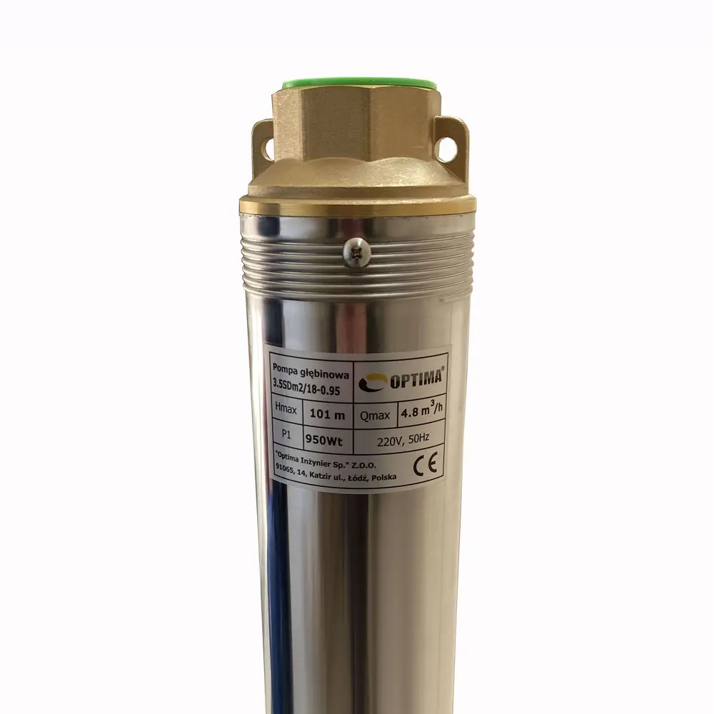 Насос OPTIMA 3.5SDm2 / 18 0.95 кВт 101м складається з двох частин: двигун в нижній частині і насос у верхній частині, жорстко зєднані між собою зубчастої муфтою міжнародного стандарту Nema і має забір води в середній частині корпусу. Насос относятітся до насосів відцентрового типу і має багатоступеневу конструкцію і «плаваючі» робочі колеса, завдяки яким реалізується підвищена стійкість до піску (до 1500 г / м3).