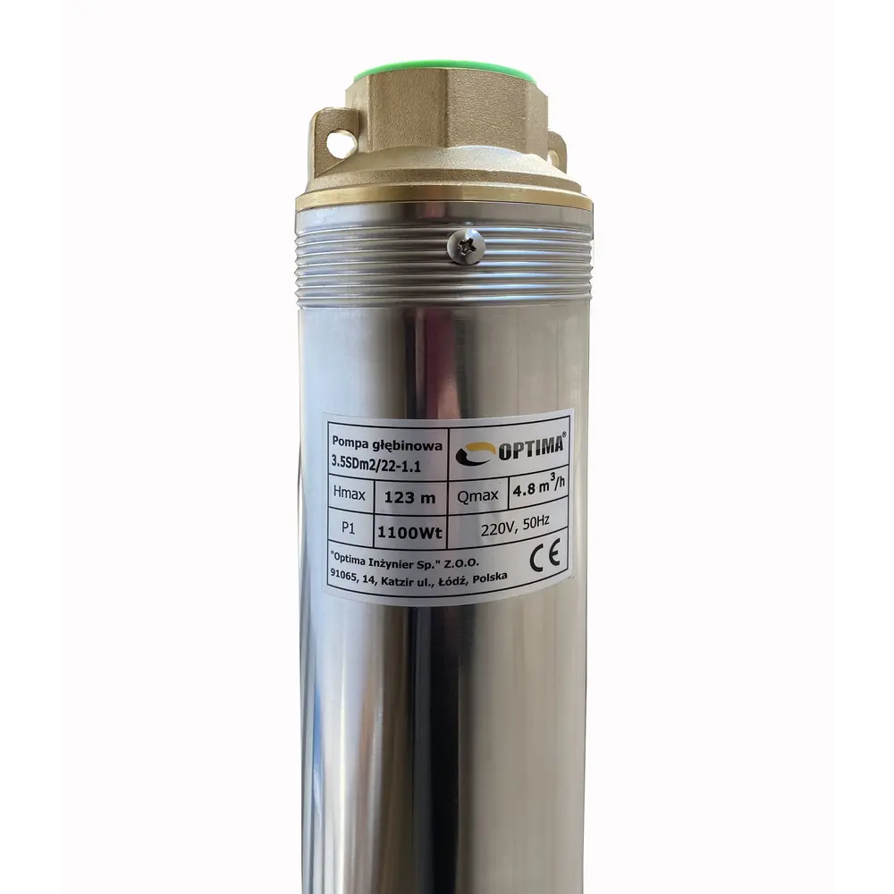 OPTIMA 3.5SDm2 / 22 1,1 кВт 123м оснащений асинхронним однофазними двигуном з коротко замкнутим ротором і «плаваючим» робочим колесом, для реалізації підвищеної стійкості до піску. Насос комплектується вбудованим в пульт теплової захистом, а також конденсаторним блоком. Двигун заповнений спеціальним мінеральним маслом для ефективного охолодження (тепловіддачі в навколишнє середовище), а також для змащення й охолодження підшипників і механічного ущільнення.