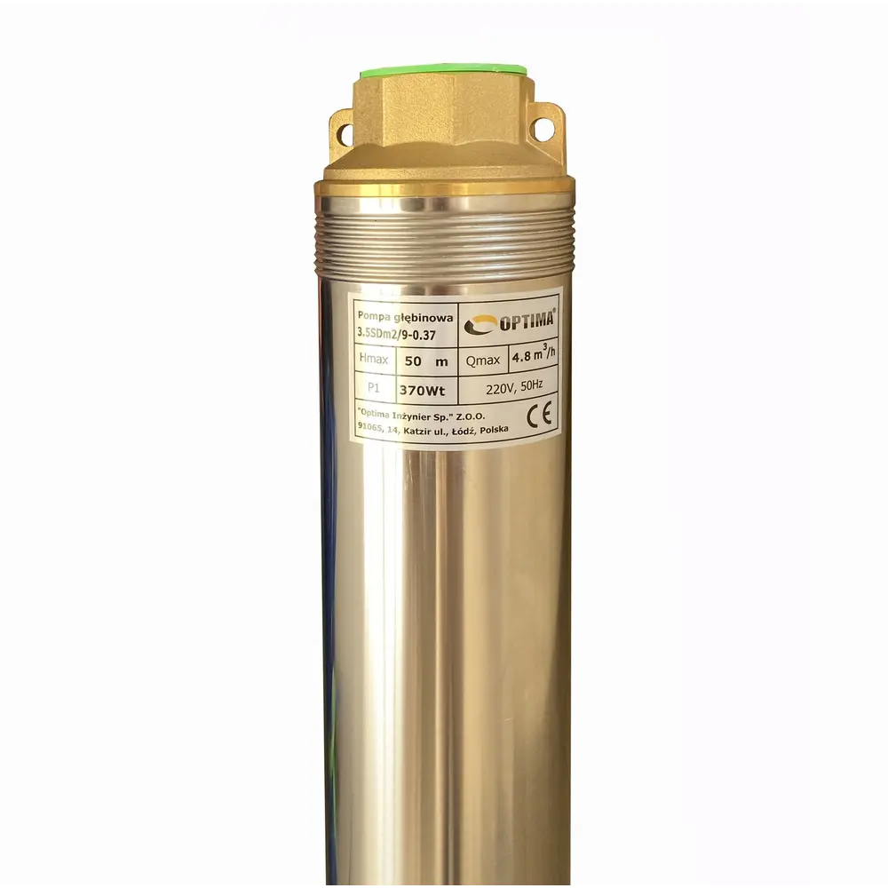 OPTIMA 3.5SDm2 / 9 0,37 кВт 50м оснащений асинхронним однофазними двигуном з коротко замкнутим ротором і «плаваючим» робочим колесом, для реалізації підвищеної стійкості до піску. Насос комплектується вбудованим в пульт теплової захистом, а також конденсаторним блоком. Двигун заповнений спеціальним мінеральним маслом для ефективного охолодження (тепловіддачі в навколишнє середовище), а також для змащення й охолодження підшипників і механічного ущільнення.