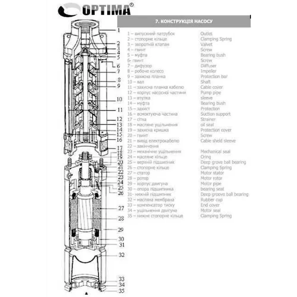 Насос OPTIMA 3.5SDm2 / 9 0,37 кВт 50м складається з двох частин: двигун в нижній частині і насос у верхній частині, жорстко зєднані між собою зубчастої муфтою міжнародного стандарту Nema і має забір води в середній частині корпусу. Насос относятітся до насосів відцентрового типу і має багатоступеневу конструкцію і «плаваючі» робочі колеса, завдяки яким реалізується підвищена стійкість до піску (до 1500 г / м3).