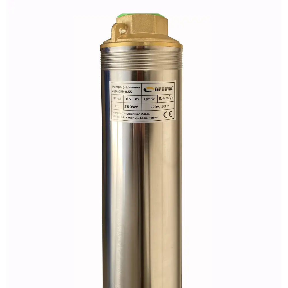 НасосOPTIMA 4SDm3 / 9 0.55 кВт 65м складається з двох частин: двигун в нижній частині і насос у верхній частині, жорстко зєднані між собою зубчастої муфтою міжнародного стандарту Nema і має забір води в середній частині корпусу. Насос относятітся до насосів відцентрового типу і має багатоступеневу конструкцію і «плаваючі» робочі колеса, завдяки яким реалізується підвищена стійкість до піску (до 2000 г / м3).