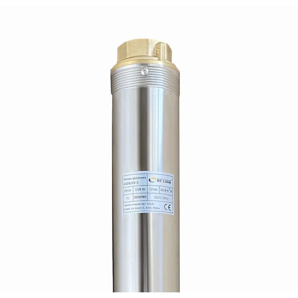 Насос свердловинний з підвищеною стійкістю до піску OPTIMA 4SD8 / 20 3 кВт 116м 3-х фазний діаметром 4 "призначений для подачі води з свердловин (діаметром від 4" або 100 мм) і відкритих водойм з глибиною більше ніж 9 м, коли використання поверхневого насоса неможливо або недоцільно.