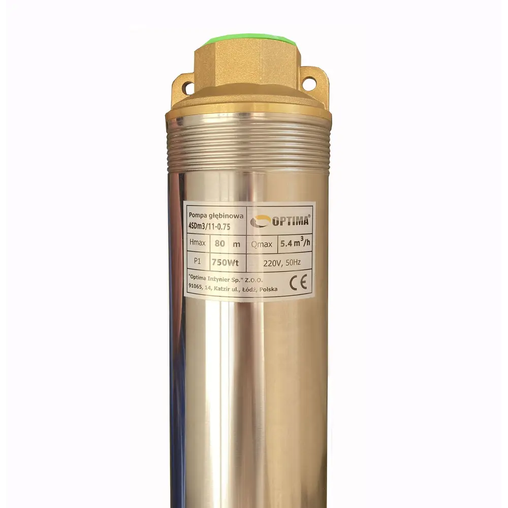 Насос OPTIMA 4SDm3 / 11 0.75 кВт 80м оснащений асинхронним однофазними двигуном з коротко замкнутим ротором і «плаваючим» робочим колесом, для реалізації підвищеної стійкості до піску. Насос комплектується вбудованим в пульт теплової захистом, а також конденсаторним блоком. Двигун заповнений спеціальним мінеральним маслом для ефективного охолодження (тепловіддачі в навколишнє середовище), а також для змащення й охолодження підшипників і механічного ущільнення.