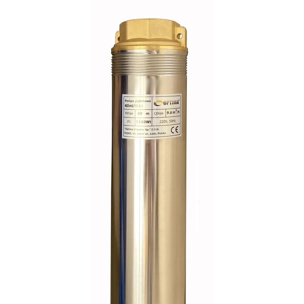Насос OPTIMA 4SDm6 / 11 1.1 кВт 69м складається з двох частин: двигун в нижній частині і насос у верхній частині, жорстко зєднані між собою зубчастої муфтою міжнародного стандарту Nema і має забір води в середній частині корпусу. Насос относятітся до насосів відцентрового типу і має багатоступеневу конструкцію і «плаваючі» робочі колеса, завдяки яким реалізується підвищена стійкість до піску (до 2000 г / м3).