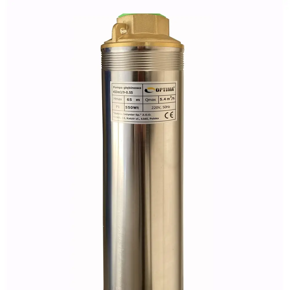 НасосOPTIMA 4SDm3 / 9 0.55 кВт 65м складається з двох частин: двигун в нижній частині і насос у верхній частині, жорстко з'єднані між собою зубчастої муфтою міжнародного стандарту Nema і має забір води в середній частині корпусу. Насос относятітся до насосів відцентрового типу і має багатоступеневу конструкцію і «плаваючі» робочі колеса, завдяки яким реалізується підвищена стійкість до піску (до 2000 г / м3).