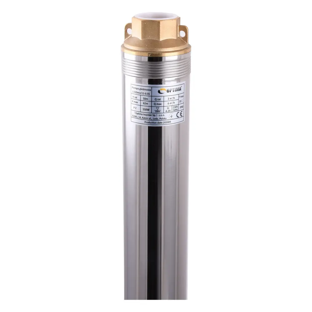 Насос OPTIMA 3.5SDm3 / 11 0.55 кВт 62м складається з двох частин: двигун в нижній частині і насос у верхній частині, жорстко з'єднані між собою зубчастої муфтою міжнародного стандарту Nema і має забір води в середній частині корпусу. Насос относятітся до насосів відцентрового типу і має багатоступеневу конструкцію і «плаваючі» робочі колеса, завдяки яким реалізується підвищена стійкість до піску (до 1500 г / м3).