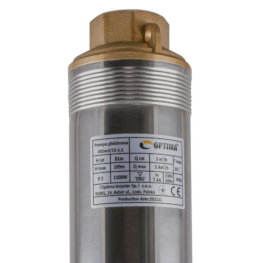 Насос OPTIMA 4SDm3 / 15 1.1 кВт 109м оснащений асинхронним однофазними двигуном з коротко замкнутим ротором і «плаваючим» робочим колесом, для реалізації підвищеної стійкості до піску. Насос комплектується вбудованим в пульт теплової захистом, а також конденсаторним блоком. Двигун заповнений спеціальним мінеральним маслом для ефективного охолодження (тепловіддачі в навколишнє середовище), а також для змащення й охолодження підшипників і механічного ущільнення.