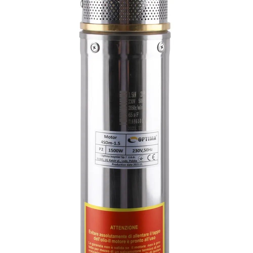 Насос OPTIMA 4SDm3 / 15 1.1 кВт 109м обладнань асинхронні однофазні двигуни з коротко замкнутим ротором и «Плаваюча» робочим колесом, для реализации підвіщеної стійкості до піску. Насос комплектується вбудованим в пульт теплової захисту, а такоже конденсаторних блоком. Двигун заповнений спеціальнім мінеральнім маслом для ефективного охолодження (тепловіддачі в Навколишнє середовище), а такоже для змащення й охолодження ПІДШИПНИКІВ и механічного ущільнення.