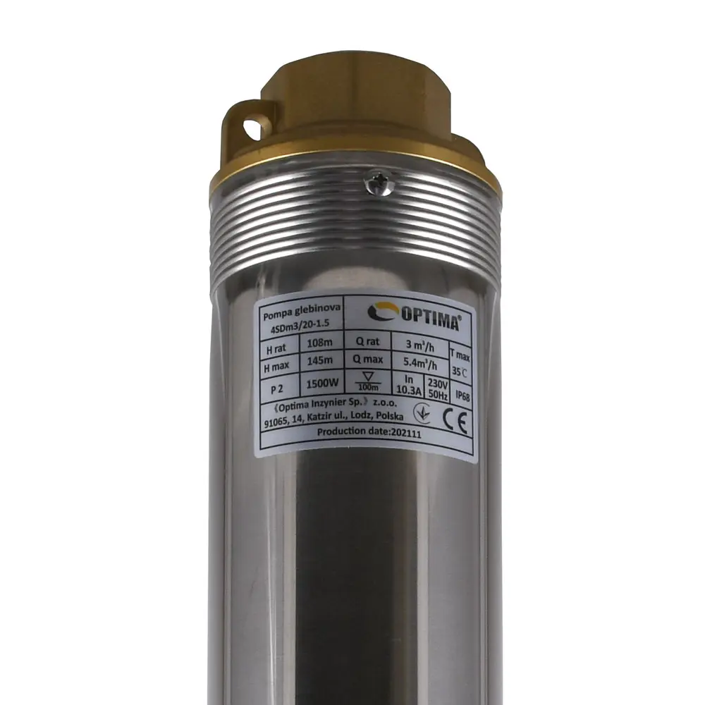 Насос OPTIMA 4SDm3 / 15 1.1 кВт 109м складається з двох частин: двигун в Нижній части и насос у верхній части, жорсткий з'єднані между собою зубчастої муфти МІЖНАРОДНОГО стандарту Nema и має забір води в середній части корпусу. Насос относятітся до насосів відцентрового типу и має багатоступеневу конструкцію и «плаваючі» робочі колеса, Завдяк Яким реалізується підвіщена стійкість до піску (до 2000 г / м3).