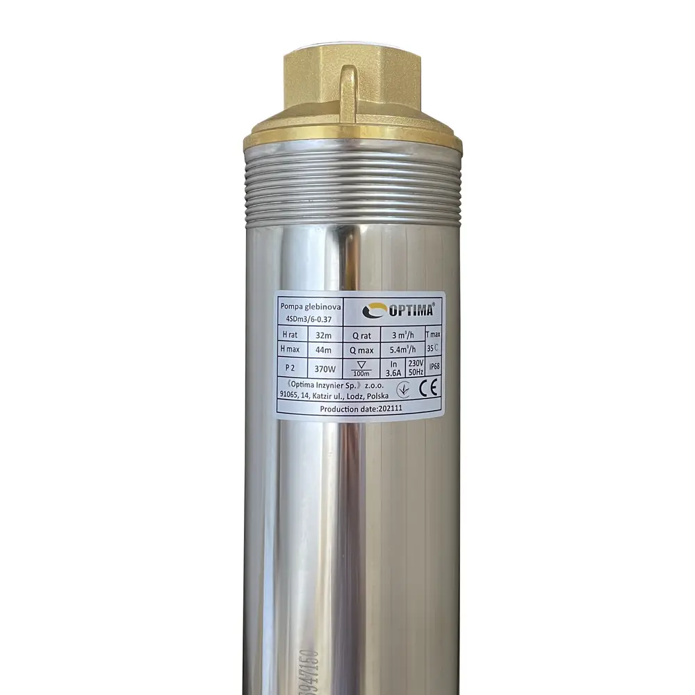 Насос OPTIMA 4SDm3 / 6 0.37 кВт 44м складається з двох частин: двигун в нижній частині і насос у верхній частині, жорстко з'єднані між собою зубчастої муфтою міжнародного стандарту Nema і має забір води в середній частині корпусу. Насос относятітся до насосів відцентрового типу і має багатоступеневу конструкцію і «плаваючі» робочі колеса, завдяки яким реалізується підвищена стійкість до піску (до 2000 г / м3).