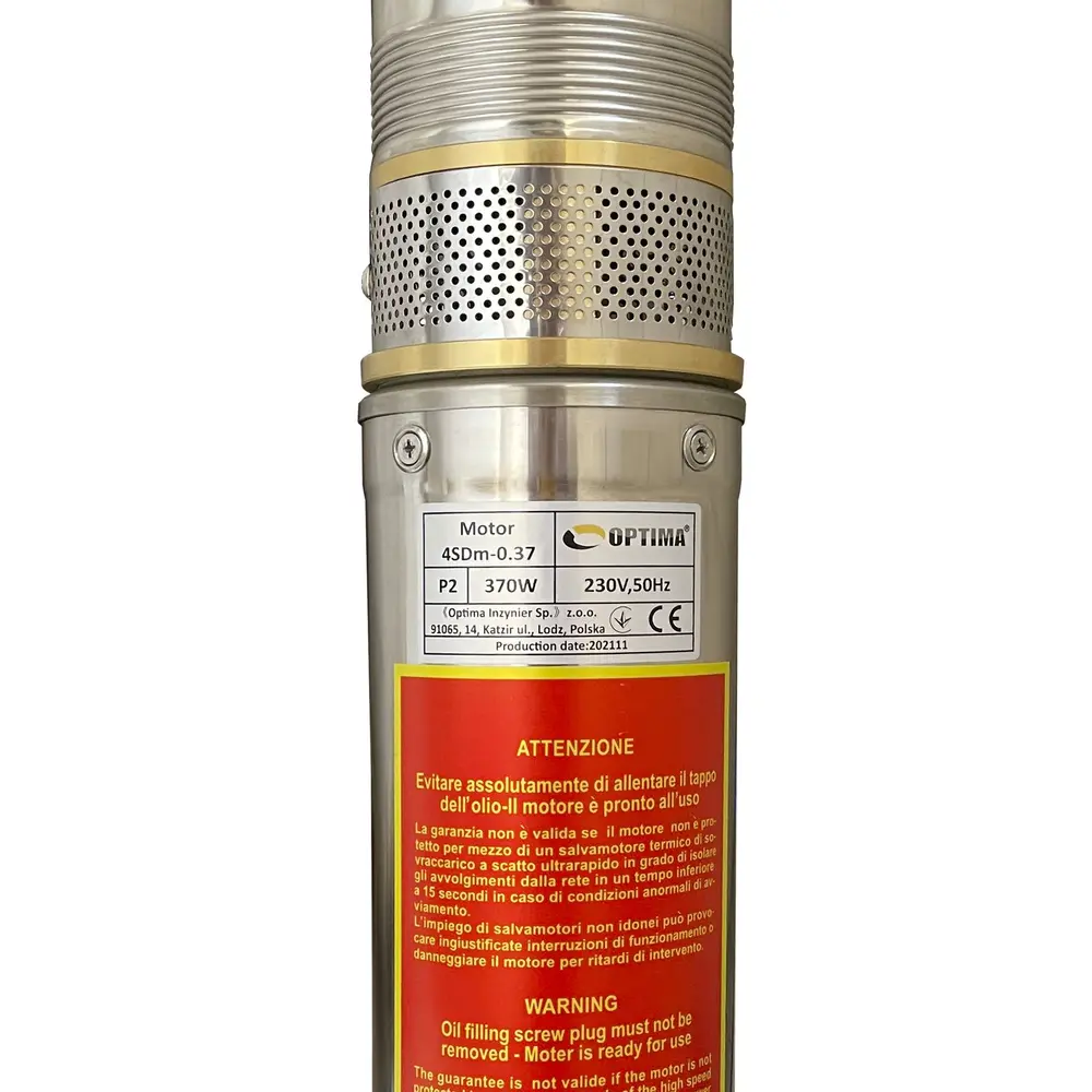Насос OPTIMA 4SDm3 / 6 0.37 кВт 44м оснащений асинхронним однофазними двигуном з коротко замкнутим ротором і «плаваючим» робочим колесом, для реалізації підвищеної стійкості до піску. Насос комплектується вбудованим в пульт теплової захистом, а також конденсаторним блоком. Двигун заповнений спеціальним мінеральним маслом для ефективного охолодження (тепловіддачі в навколишнє середовище), а також для змащення й охолодження підшипників і механічного ущільнення.