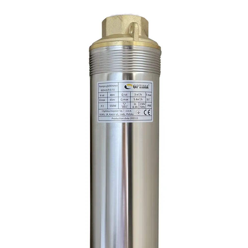 НасосOPTIMA 4SDm3 / 9 0.55 кВт 65м складається з двох частин: двигун в нижній частині і насос у верхній частині, жорстко з'єднані між собою зубчастої муфтою міжнародного стандарту Nema і має забір води в середній частині корпусу. Насос относятітся до насосів відцентрового типу і має багатоступеневу конструкцію і «плаваючі» робочі колеса, завдяки яким реалізується підвищена стійкість до піску (до 2000 г / м3).
