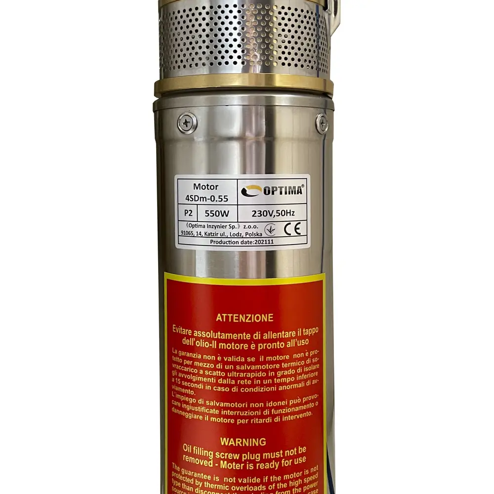 Насос OPTIMA 4SDm3 / 9 0.55 кВт 65м оснащений асинхронним однофазними двигуном з коротко замкнутим ротором і «плаваючим» робочим колесом, для реалізації підвищеної стійкості до піску. Насос комплектується вбудованим в пульт теплової захистом, а також конденсаторним блоком. Двигун заповнений спеціальним мінеральним маслом для ефективного охолодження (тепловіддачі в навколишнє середовище), а також для змащення й охолодження підшипників і механічного ущільнення.