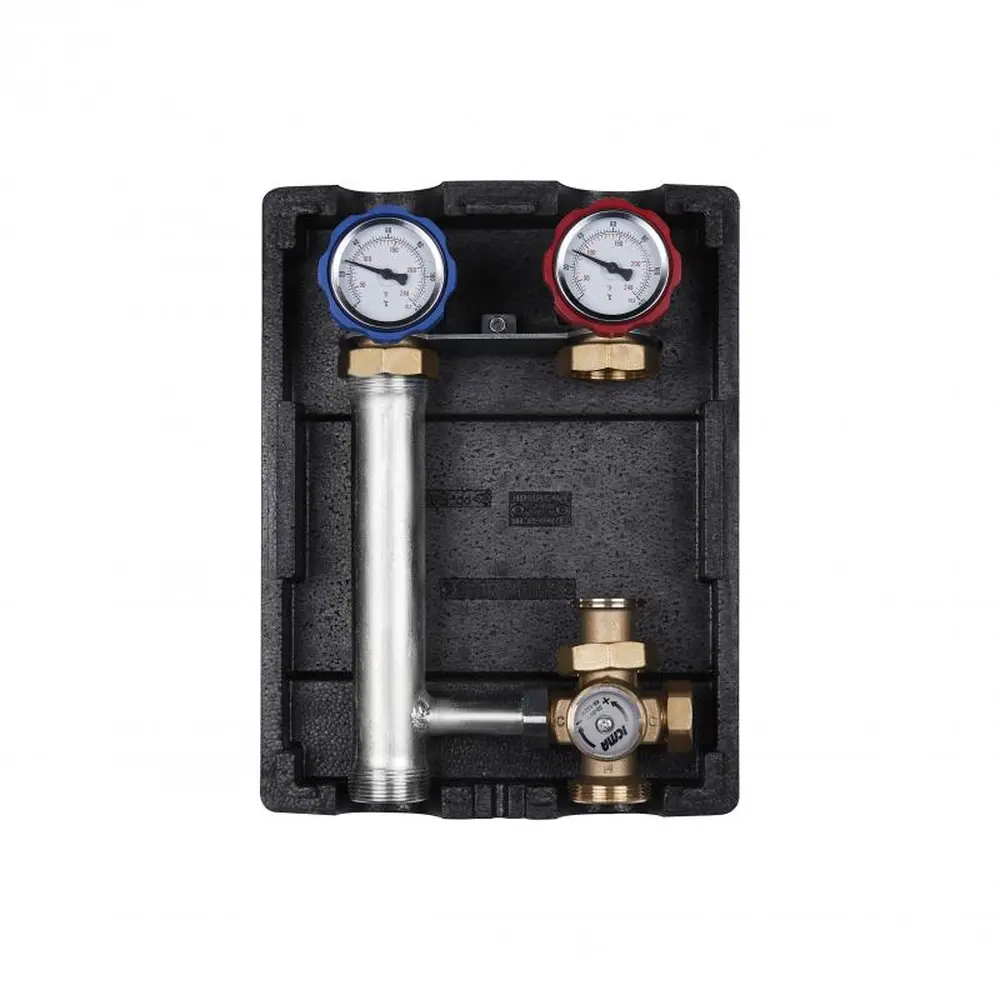 Насосна група ICMA R004 служить для регулювання температури і подачі теплоносія в багатоповерховому чи багатоквартирному будинку. Зазвичай встановлюється в котельні після гідрострілки. Mоже встановлюватися на спеціальному розподільному колекторі «пряма і зворотня лінії» арт. 785. Змішувальний клапан оснащений регульованим байпасом, який оберігає насос від надмірного навантаження через високий напор, в разі якщо змішувач повністю закритий. Регулювання байпасу відбувається за допомогою гвинта.