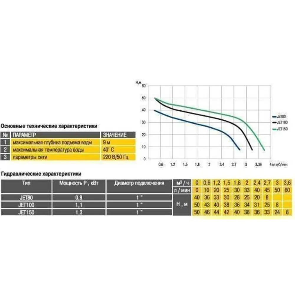 Optima JET100 1,1 кВт чавун це насос відцентрового типу з одним робочим колесом. Тиск у відцентрових насосах створюється завдяки відцентровій силі, що виникає при дії лопаток робочого колеса на рідину. Глибина підняття води до 9м досягається завдяки ежектору (трубці Вентурі) встановленому в корпусі насоса.