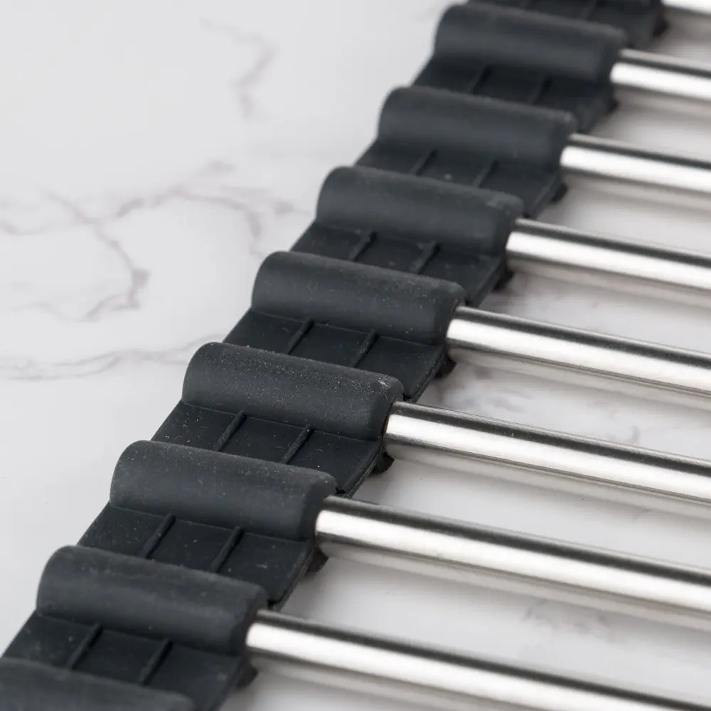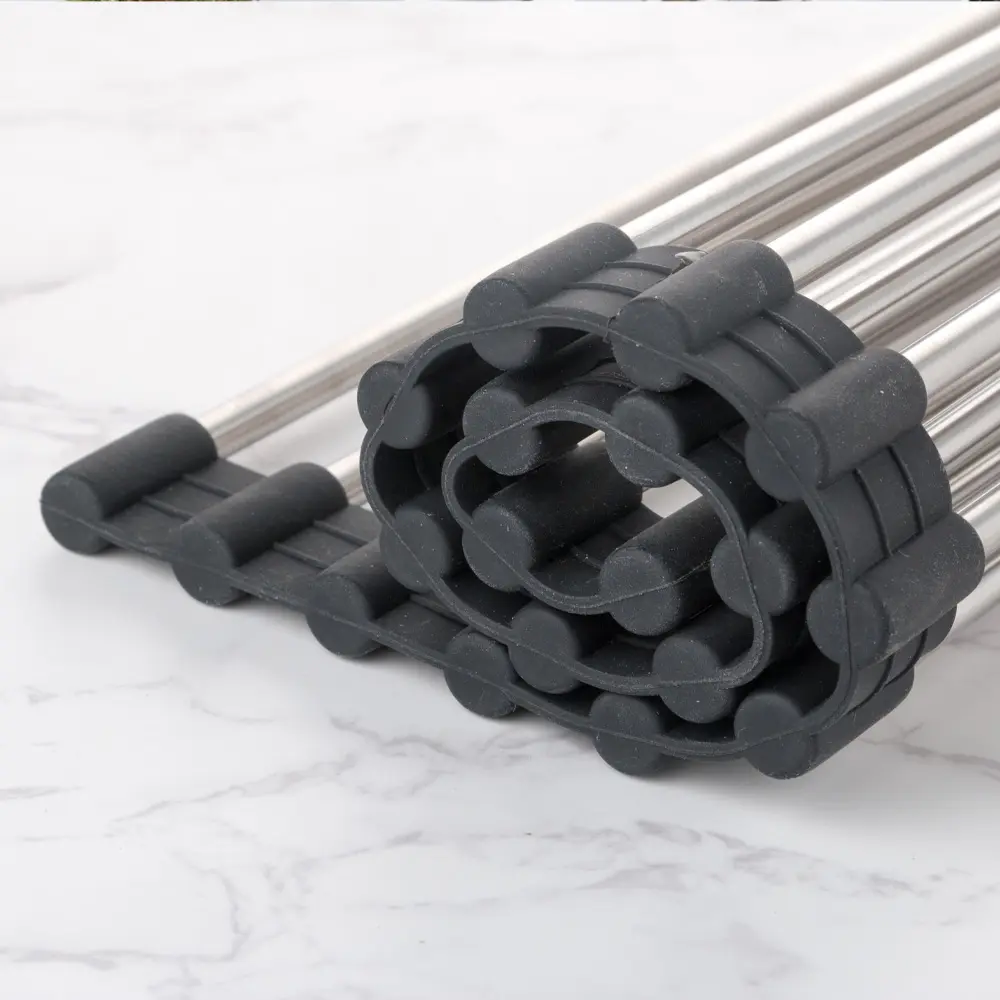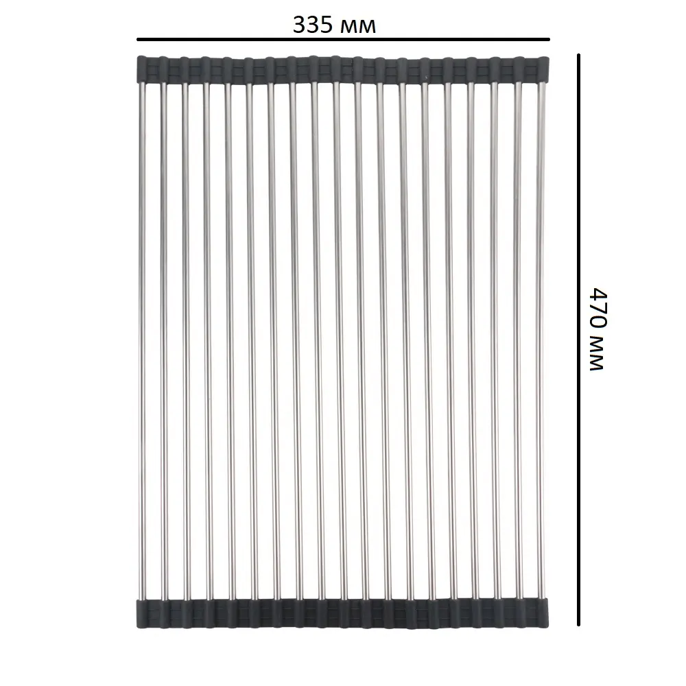 Міцна конструкція металевих прутів дозволить вам ставити на її поверхню важкий посуд, без подальшої її деформації.Так само товстий шар силіконового покриття захистить вашу мийку від зайвих подряпин посудом, запобіжить корозії металевих прутів.