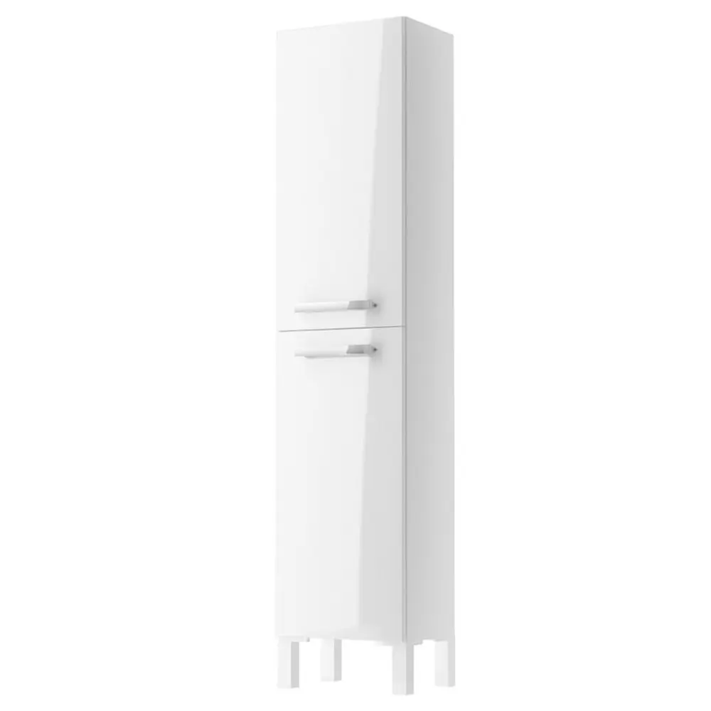 Ємний пенал MELAR оснащений міцними петлями. У центральній частині дверей є дві широкі хромовані ручки, які ідеально поєднуються з глянцевим лаком. Модель виготовлена з білого ДСП.