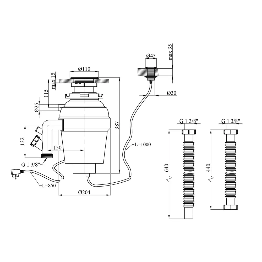 Подрібнювач, проштовхувач, фланець мийки, гумовий бризковик, що знімається, пневмовиключатель (вимикач, шнур), зливна трубка, комплект швидкого монтаж