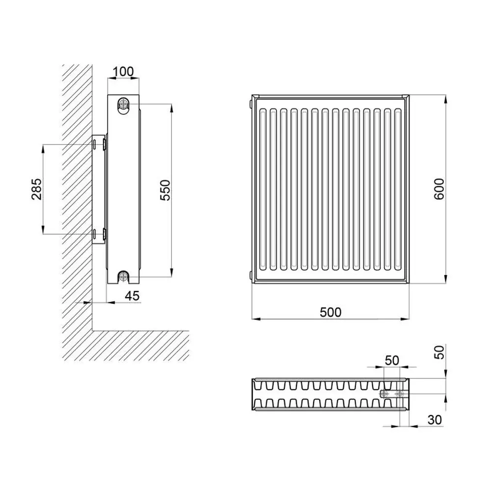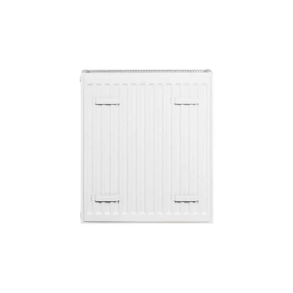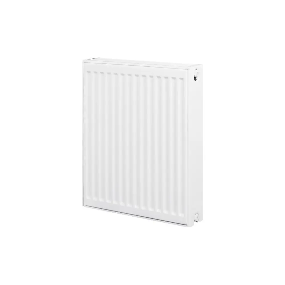 Радіатор сталевий Aquatronic 22 тип 600х500 нижнє підключення — опалювальний прилад для встановлення в автономних системах (як з примусовою, так і з природною циркуляцією теплоносія). Можливе також бічне приєднання виробу. Усі необхідні для монтажу на стіну деталі та кран Маєвського поставляються в комплекті. Верхнє покриття стійке до стирання, білого кольору. Робоча температура носія – 110 °С.