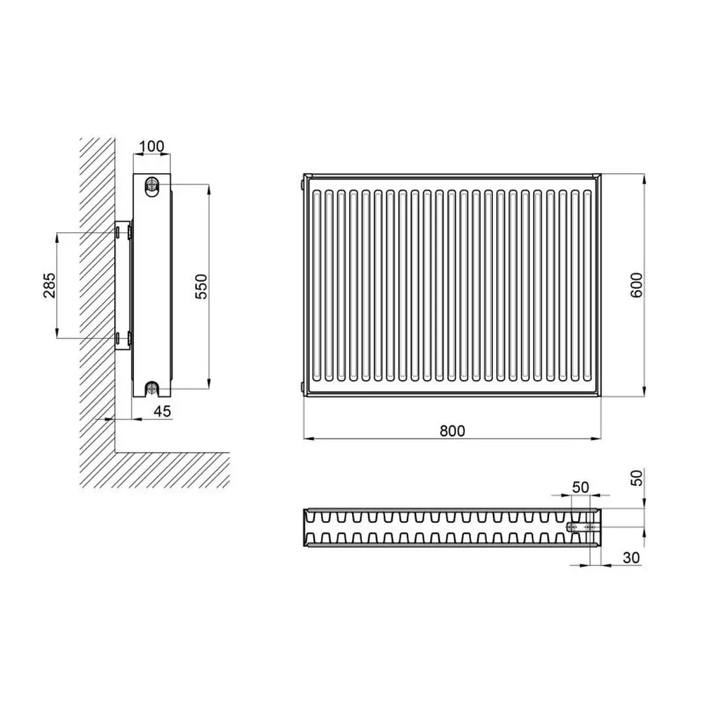 Радіатор сталевий Aquatronic 22 тип 600х800 нижнє підключення розроблений та виготовлений відповідно до всіх технічних норм. Верхнє покриття білого кольору стійке до стирання та подряпин. Усередині опалювального приладу знаходяться дві панелі, в яких відбувається рух теплоносія і стільки ж П-подібних сталевих ребер. Виріб може бути використаний як у системах опалення з примусовою, так і з природною циркуляцією робочої рідини. У комплекті — набір кріплень на стіну та кран Маєвського.